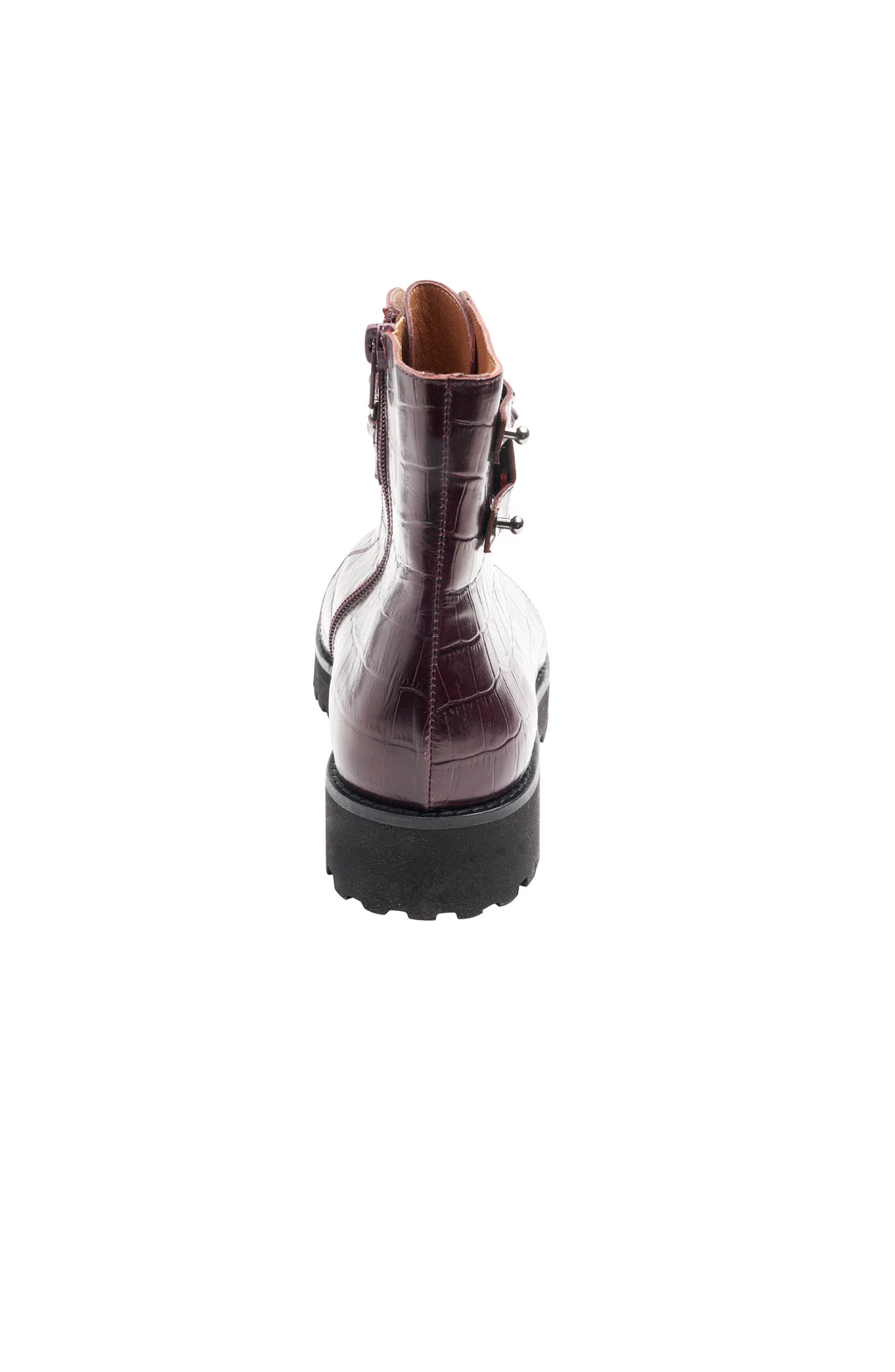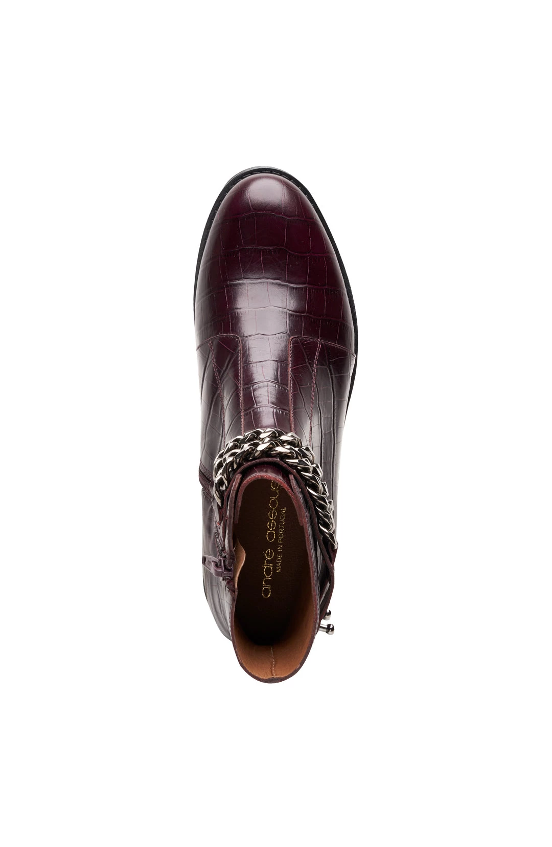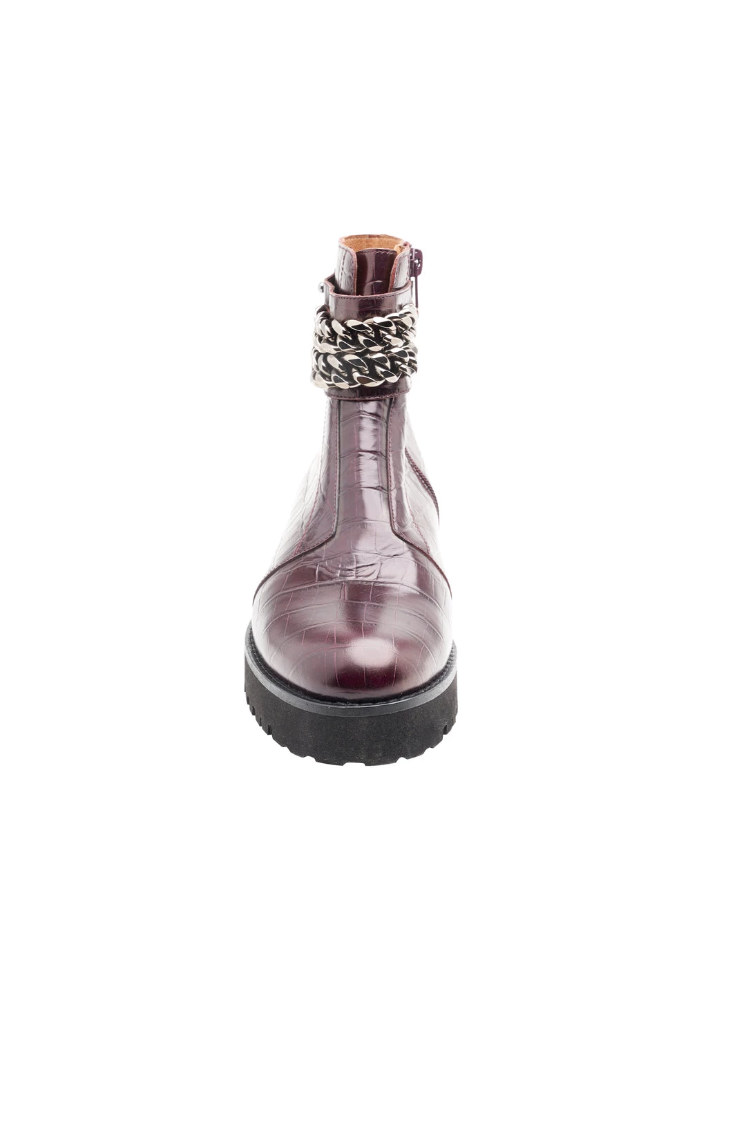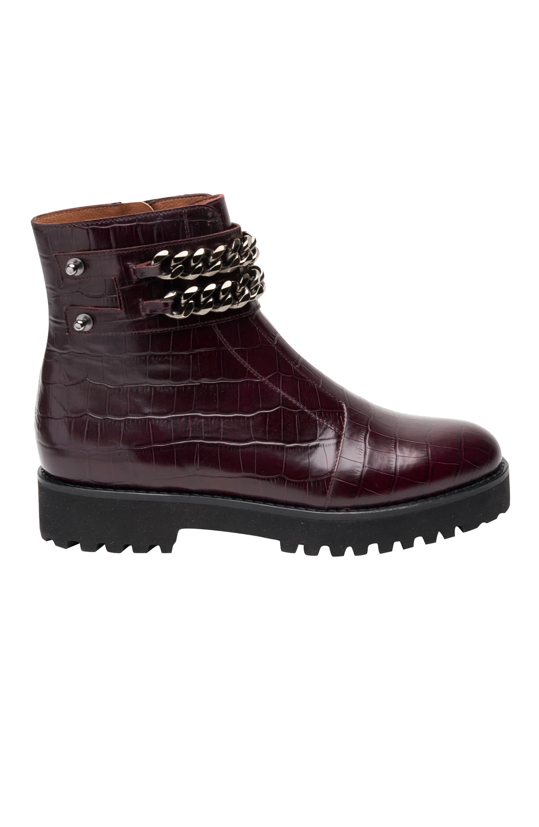 The Petunia ankle boot is adorned with a double row gold chain and a chunky lug sole to vamp up and add edge to this everyday essential pair.
