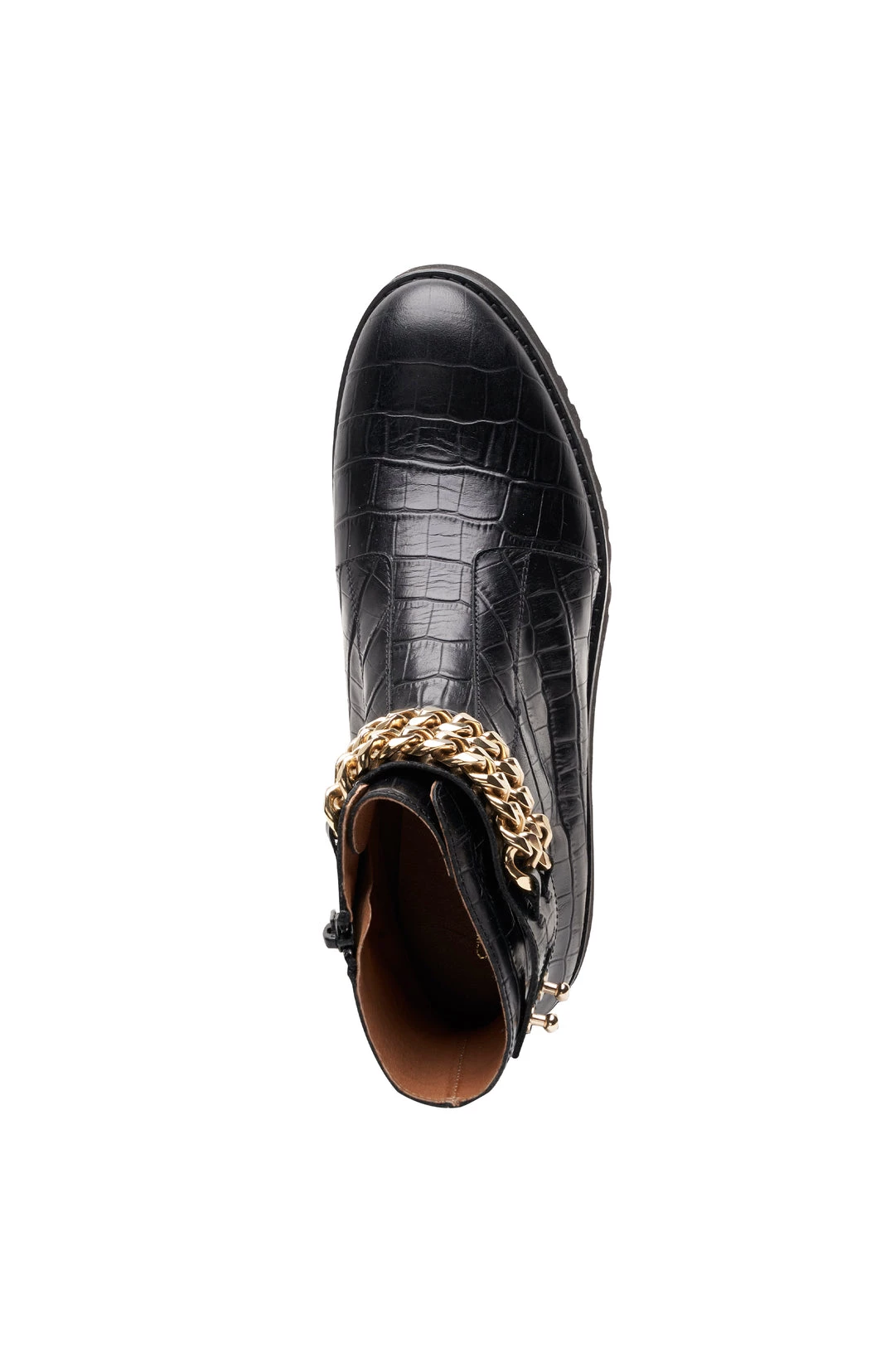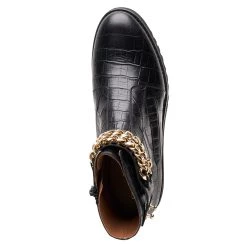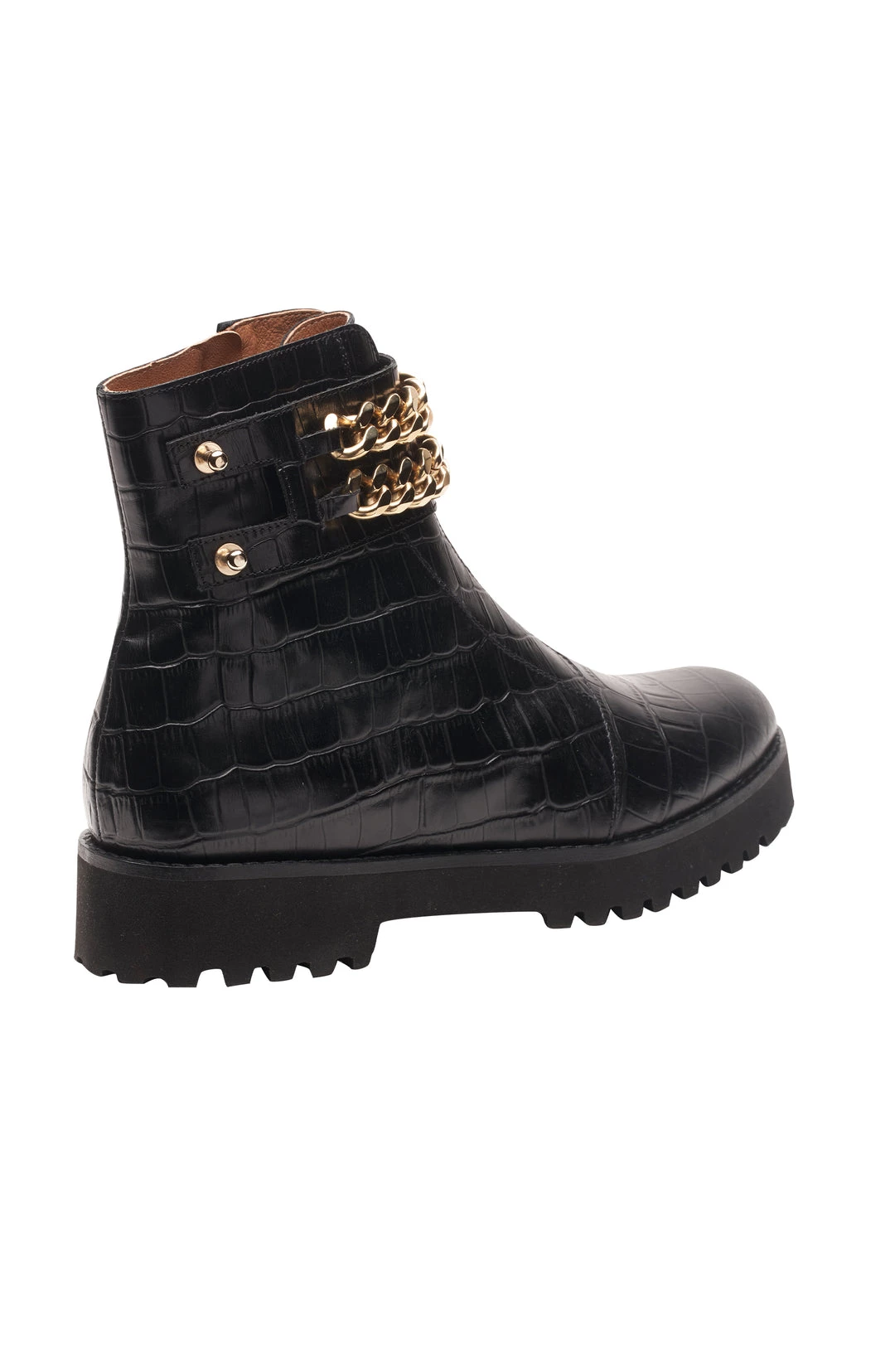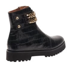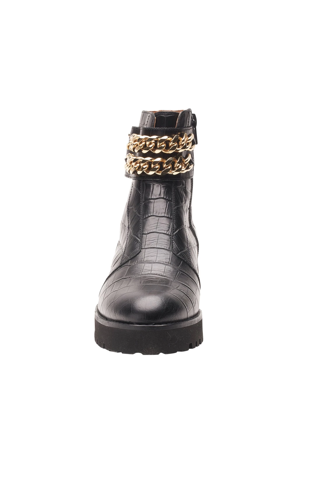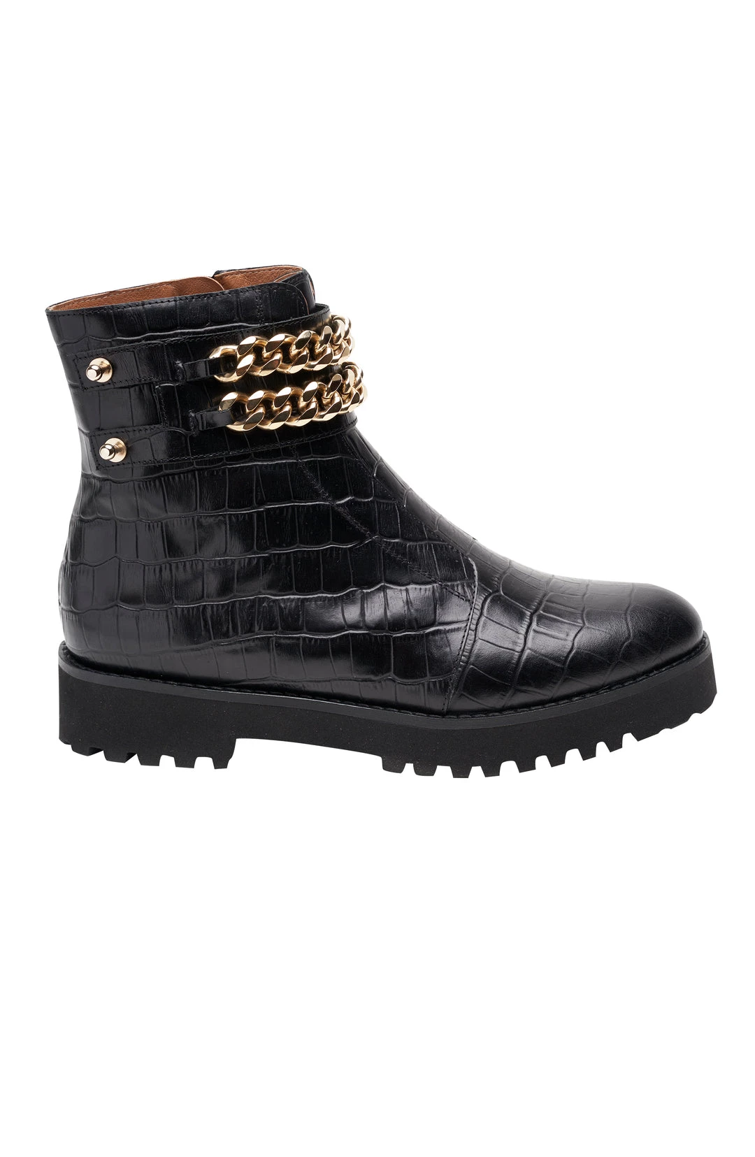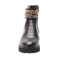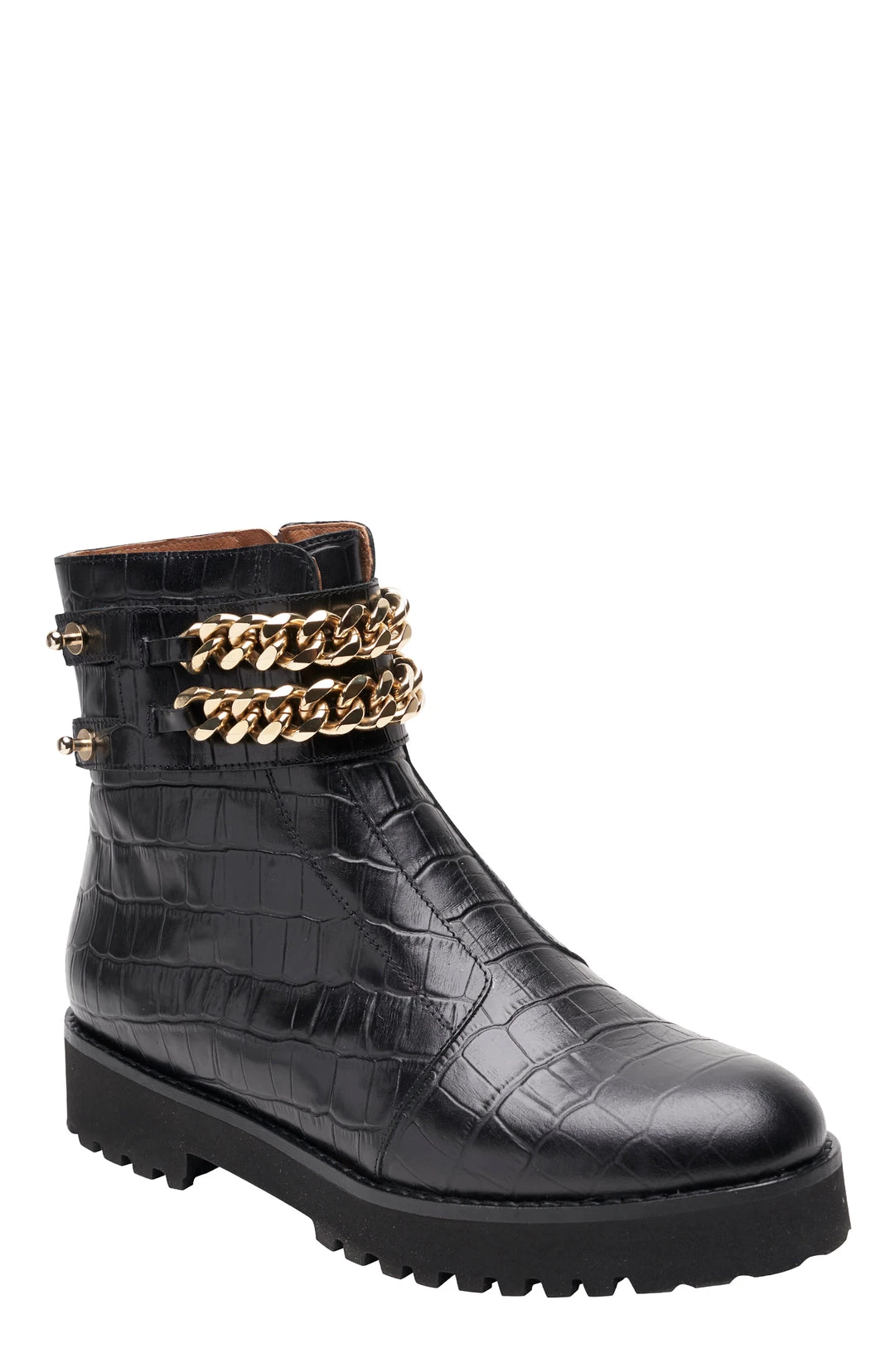 The Petunia ankle boot is adorned with a double row gold chain and a chunky lug sole to vamp up and add edge to this everyday essential pair.