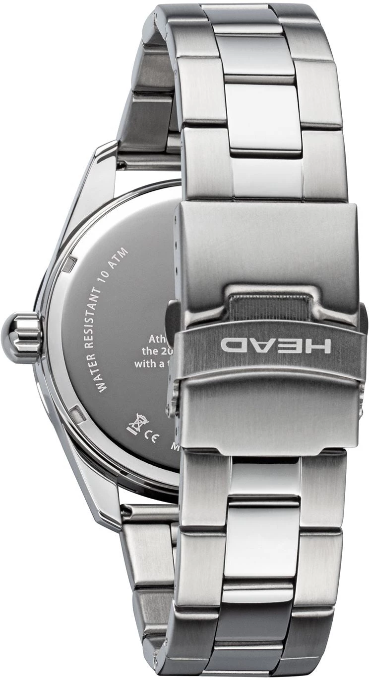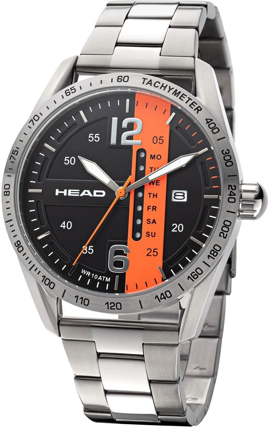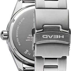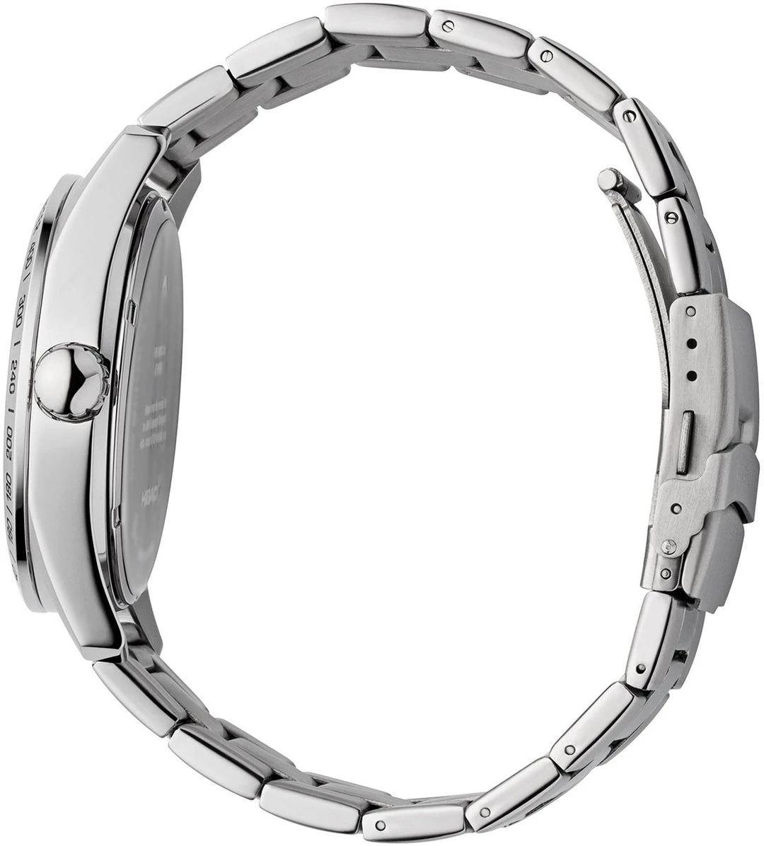The case is made of durable Stainless Steel. The case width is 44mm and the dial is protected by a Mineral Crystal. It’s water resistant up to 100 m (330 feet). The Bracelet is Silver Stainless Steel and the dial is Black. The movement is Quartz.