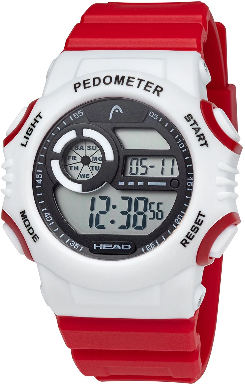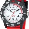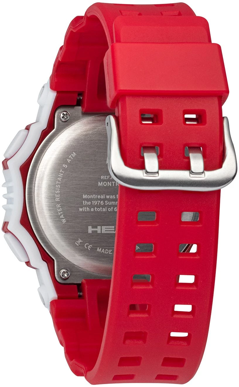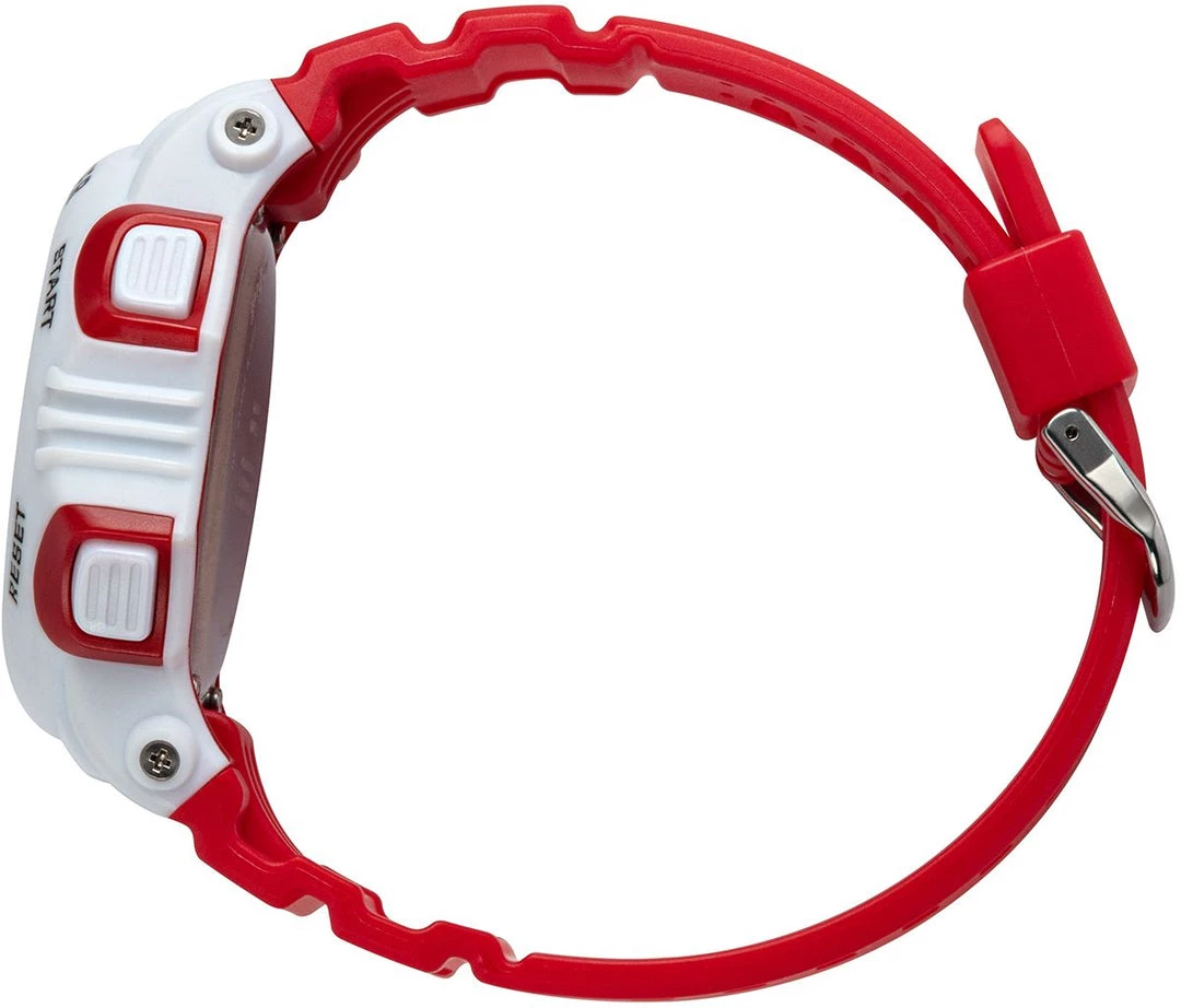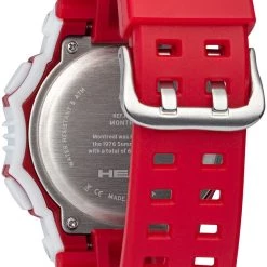The case is made of durable Resin. The case width is 49mm and the dial is protected by a Mineral Crystal. It’s water resistant up to 50 m (165 feet). The Strap is Red Silicone and the dial is Digital. The movement is Quartz.