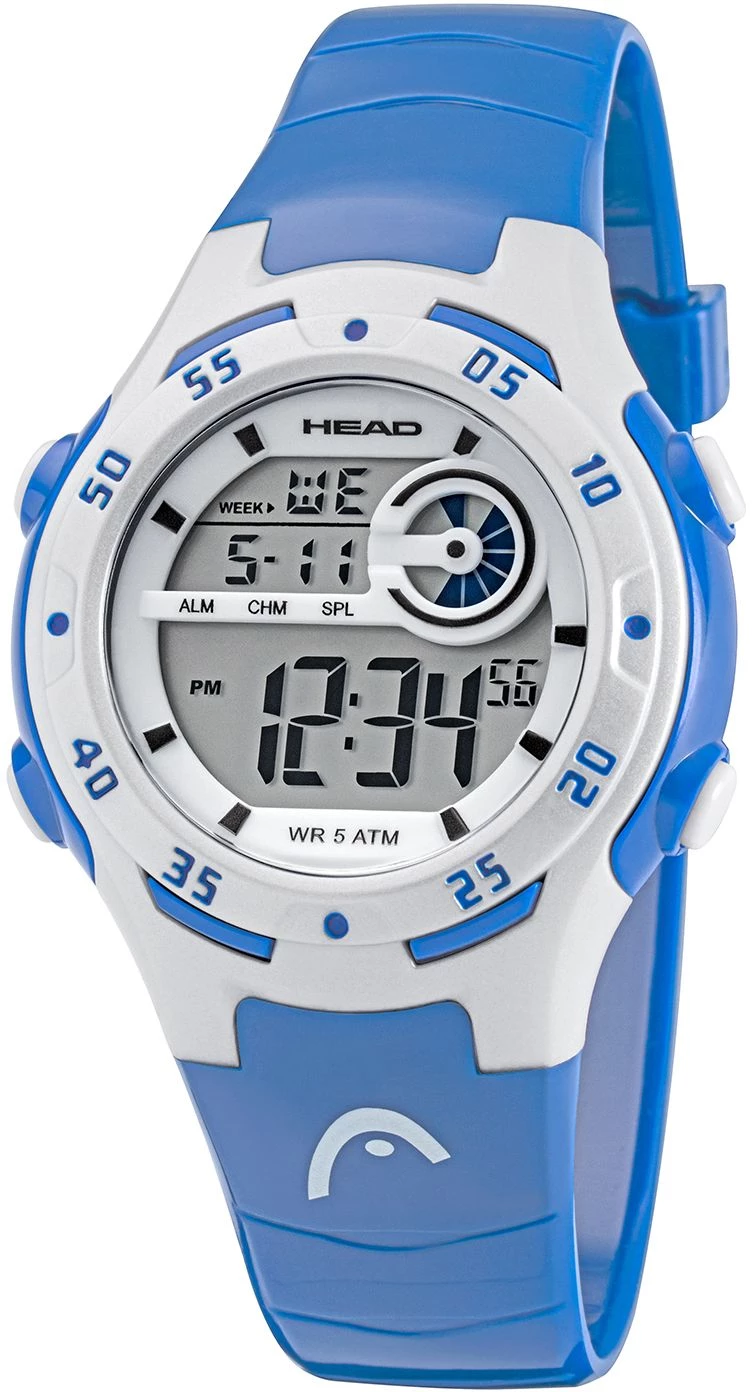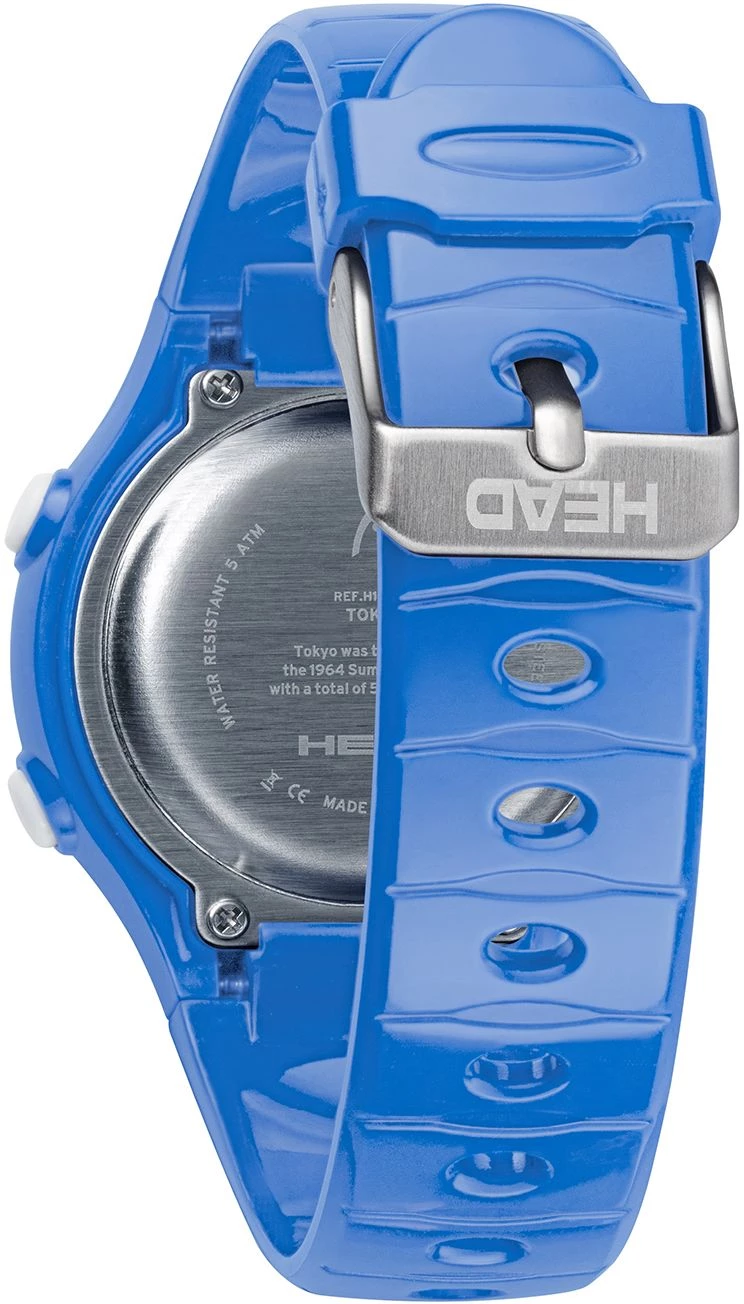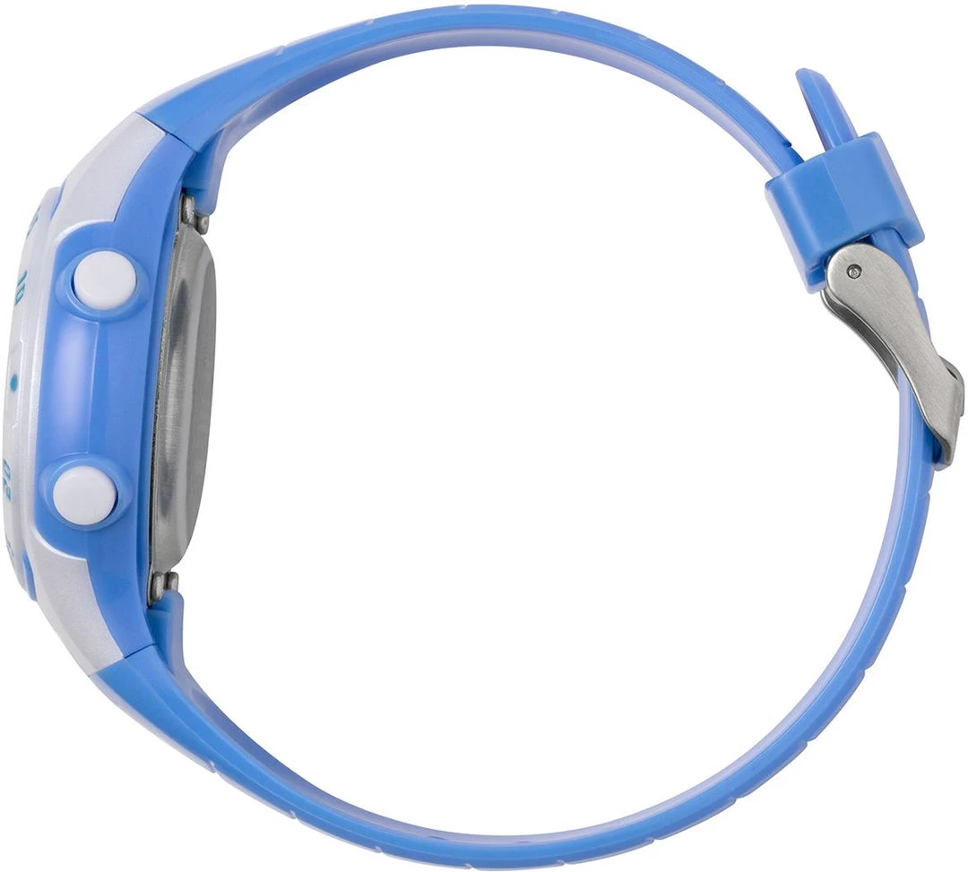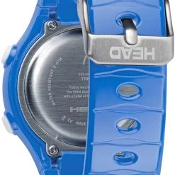 The case is made of durable Resin. The case width is 38mm and the dial is protected by a Mineral Crystal. It is water resistant up to 50 m (165 feet). The Strap is Blue Silicone and the dial is Digital. The movement of this timepiece is Quartz. (H160502)